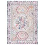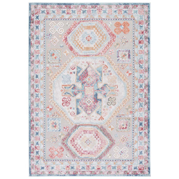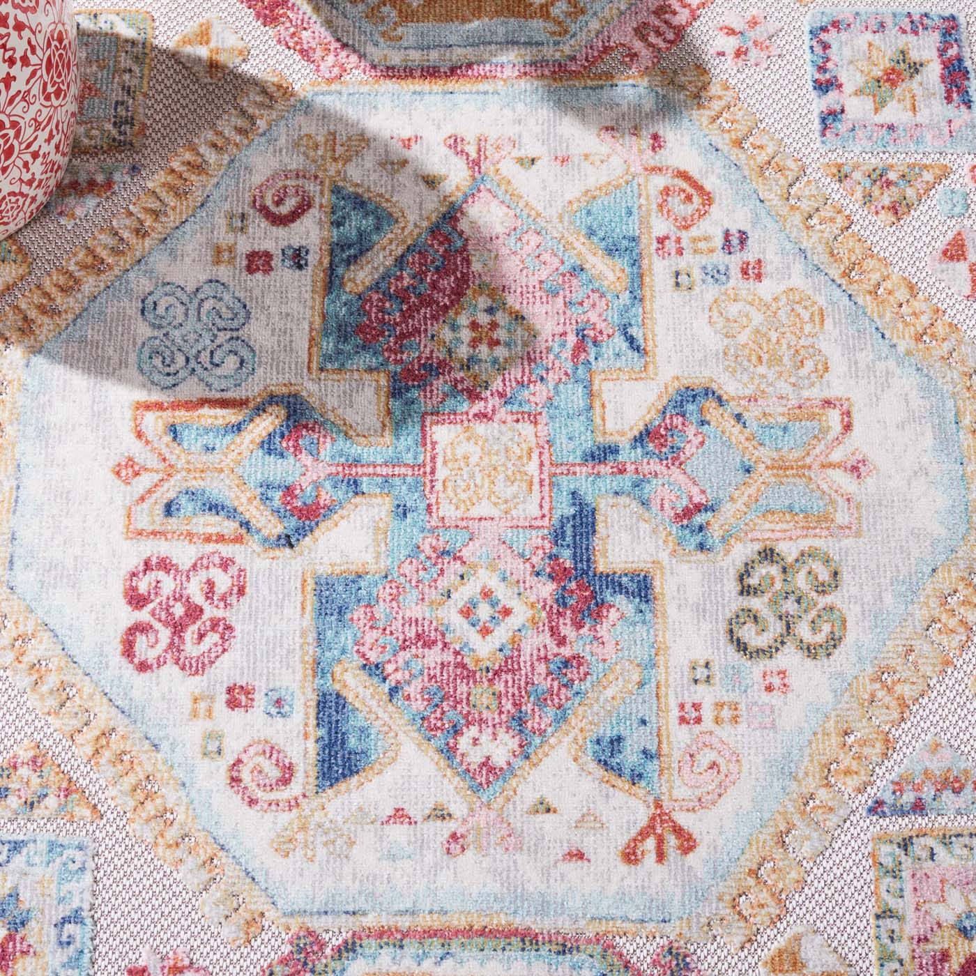 The enchanting pattern captures the essence of traditional decor, with intricate medallions and ornamental borders in a harmonious palette of rust blue and ivory. The medley of geometric and floral motifs present in the image radiate a classic sophistication that is versatile enough for both indoor and outdoor settings.