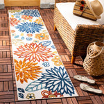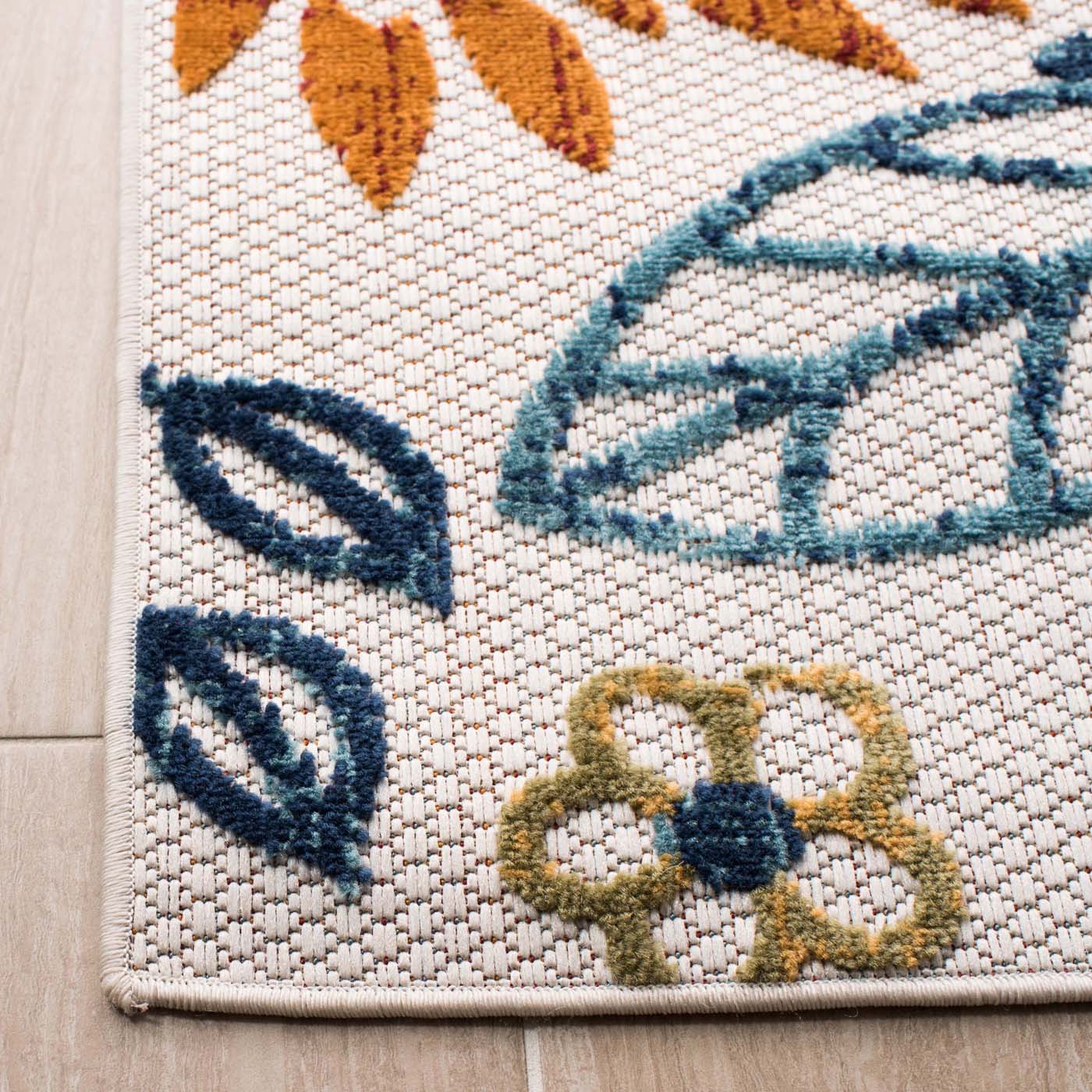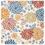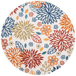 The vibrant round rug presents a delightful floral pattern that echoes the beauty of a blooming garden. Each flower and leaf is woven with precision, creating a tapestry that celebrates nature's artistry. The intricate design, as depicted in the image, features an array of blooming florals in bold reds, serene blues, and cheerful oranges, set against a soft creme backdrop that accentuates the liveliness of the pattern.