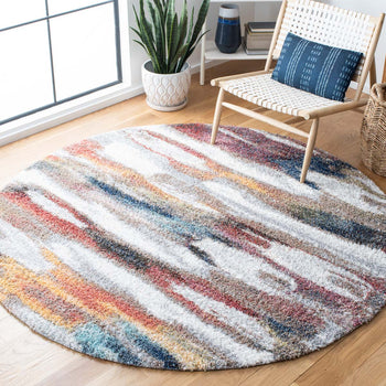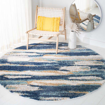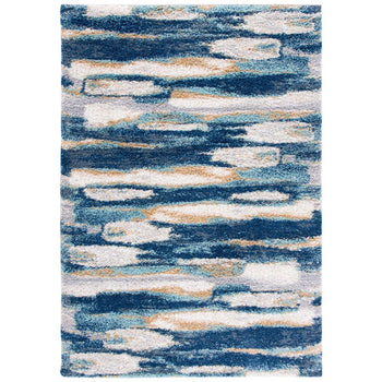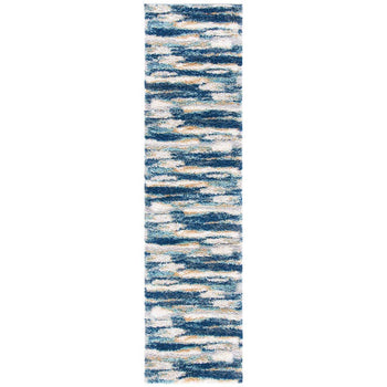 The lush 1-inch pile height provides a soft, plush feel underfoot, inviting you to step into comfort every day. The artistic blend of blue and ivory hues creates a serene backdrop for the dynamic, abstract striated pattern that dances across its length. This chromatic harmony sets a calming, yet sophisticated tone in your living space.
