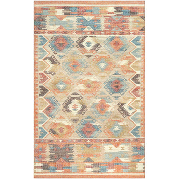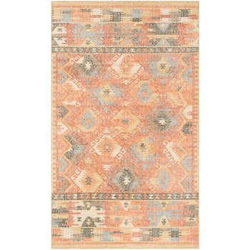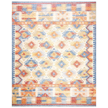 The rug features an intricate pattern that draws inspiration from ancestral motifs, interweaving geometric shapes and symbolic designs that exude an eclectic and bohemian aesthetic. While the rug pictured may vary in size, the pattern remains a faithful guide to the captivating design and hues that your 4' X 6' rug will exhibit.