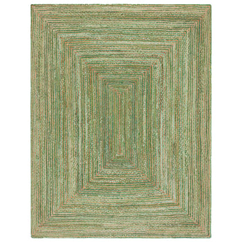 The rug's captivating pattern features concentric rectangles creating a mesmerizing geometric illusion, presented in a refreshing palette of green and natural hues that exude tranquility and organic beauty. The careful arrangement of colors accentuates each shape, adding depth and texture to the design, making it a visually engaging centerpiece for any room.
