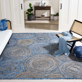Crafted with the utmost care, the rug combines the strength and texture of jute with the softness of cotton, creating a durable yet comfortable underfoot experience. The blend of natural and blue hues in the rug's design intermingles with your home's aesthetics, providing a soothing yet vibrant ambiance that enhances any space it graces.
