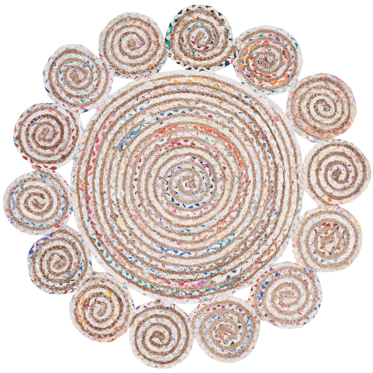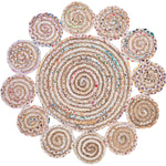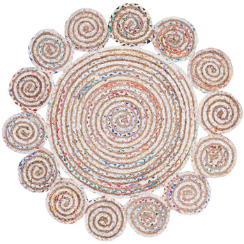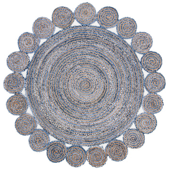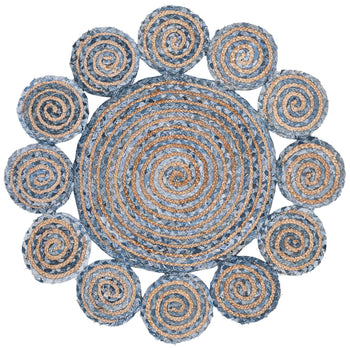 Our rug is thoughtfully designed with a captivating spiral pattern, radiating from the center in harmonious shades of blue and natural tones, creating an effortless yet striking visual effect. The gentle swirls give a nod to classic design while staying fresh and modern, suitable for a variety of living spaces. This round, playful shape adds an unexpected dimension to your flooring and is ideal for breaking up the rigid lines of furniture, lending your room a softer and more inviting look.