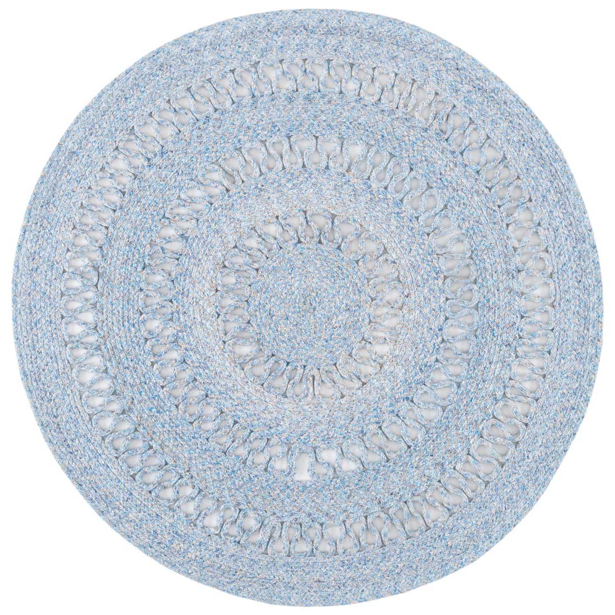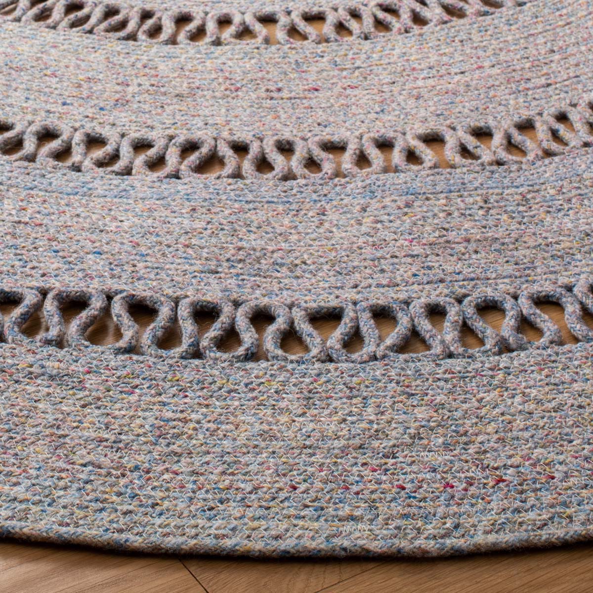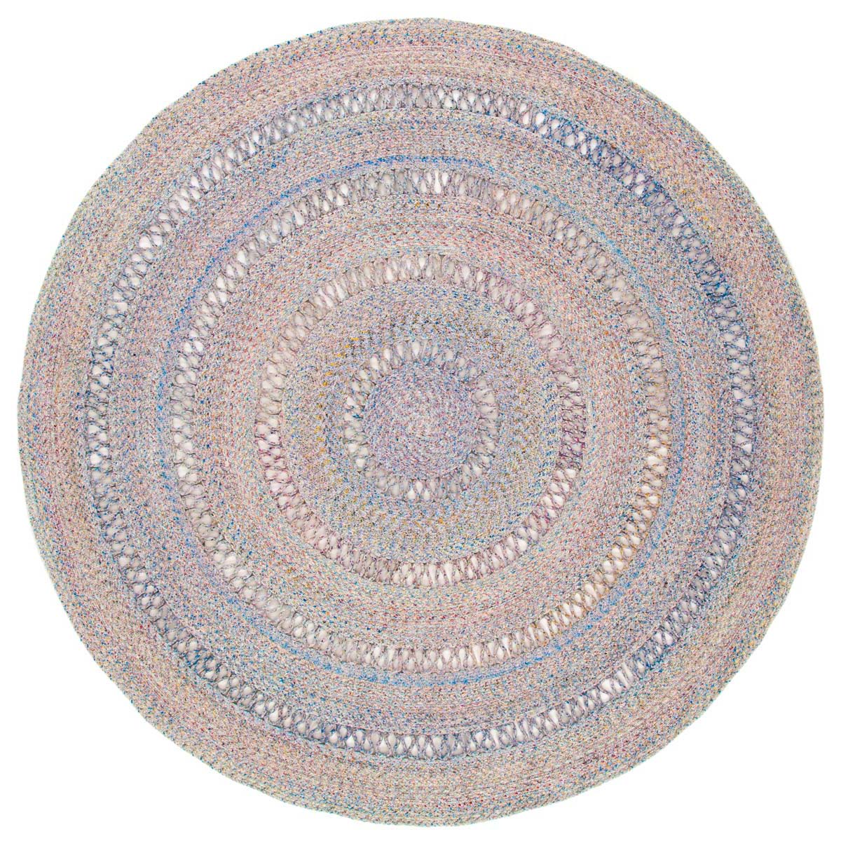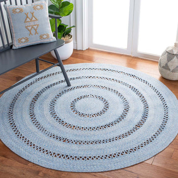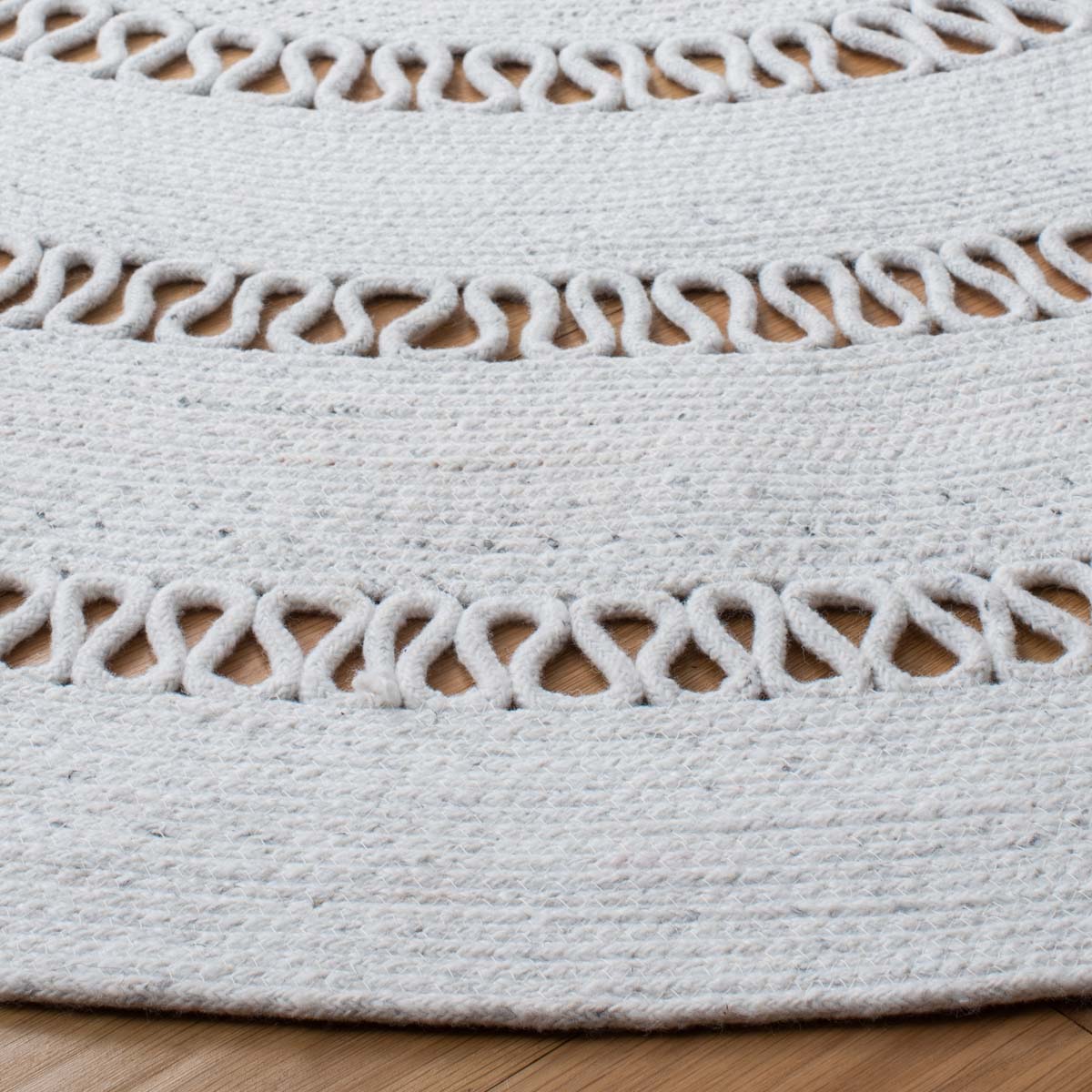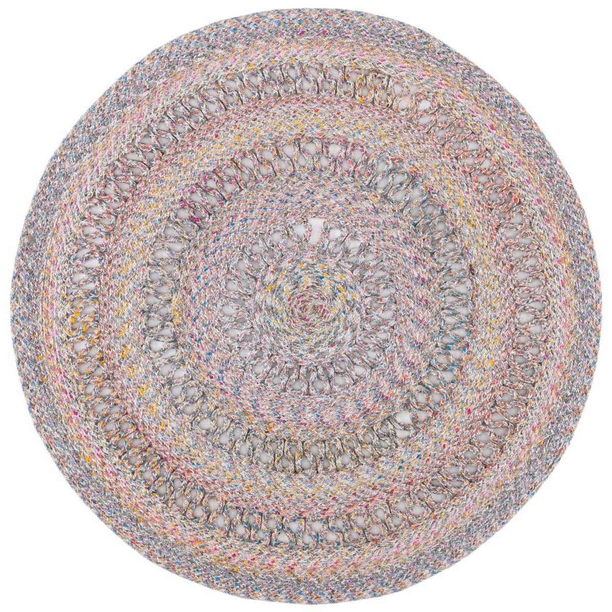 Featuring a harmonious grey palette, this round rug is designed to set a tranquil mood in your living space. The texture is accentuated by hand-woven patterns, showcasing multiple concentric circles that create a sense of depth and sophistication.