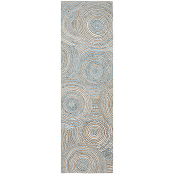 The rug's design showcases a mesmerizing pattern of concentric circles, rhythmically flowing across the runner, inviting the eye to follow the serene swirls that elicit a sense of calm and continuity. The thoughtful use of color variations within this pattern adds depth and complexity, creating a visual dialogue between the organic shapes and the surrounding space.