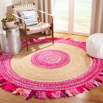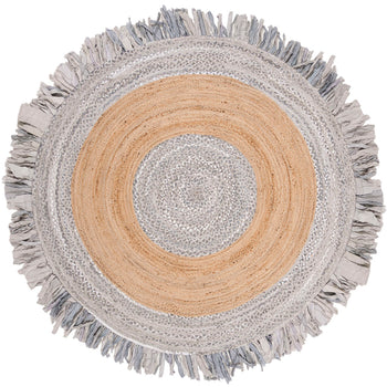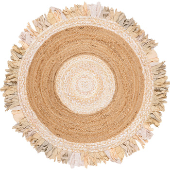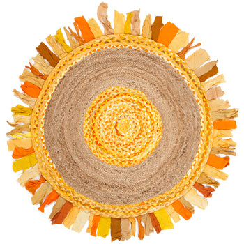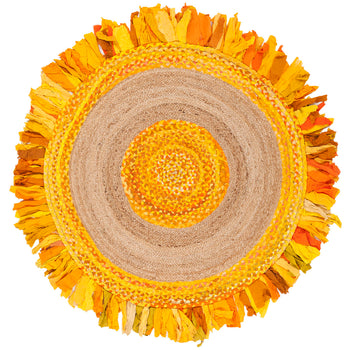 The color palette, a radiant blend of gold transitioning into a natural core, is inspired by the golden hues of sun-kissed fields and rustic simplicity. The robust, earthy tones of the jute are complemented by the playful fringe that looks like rays of sunshine, adding a dynamic, tactile element to the rug's edge.