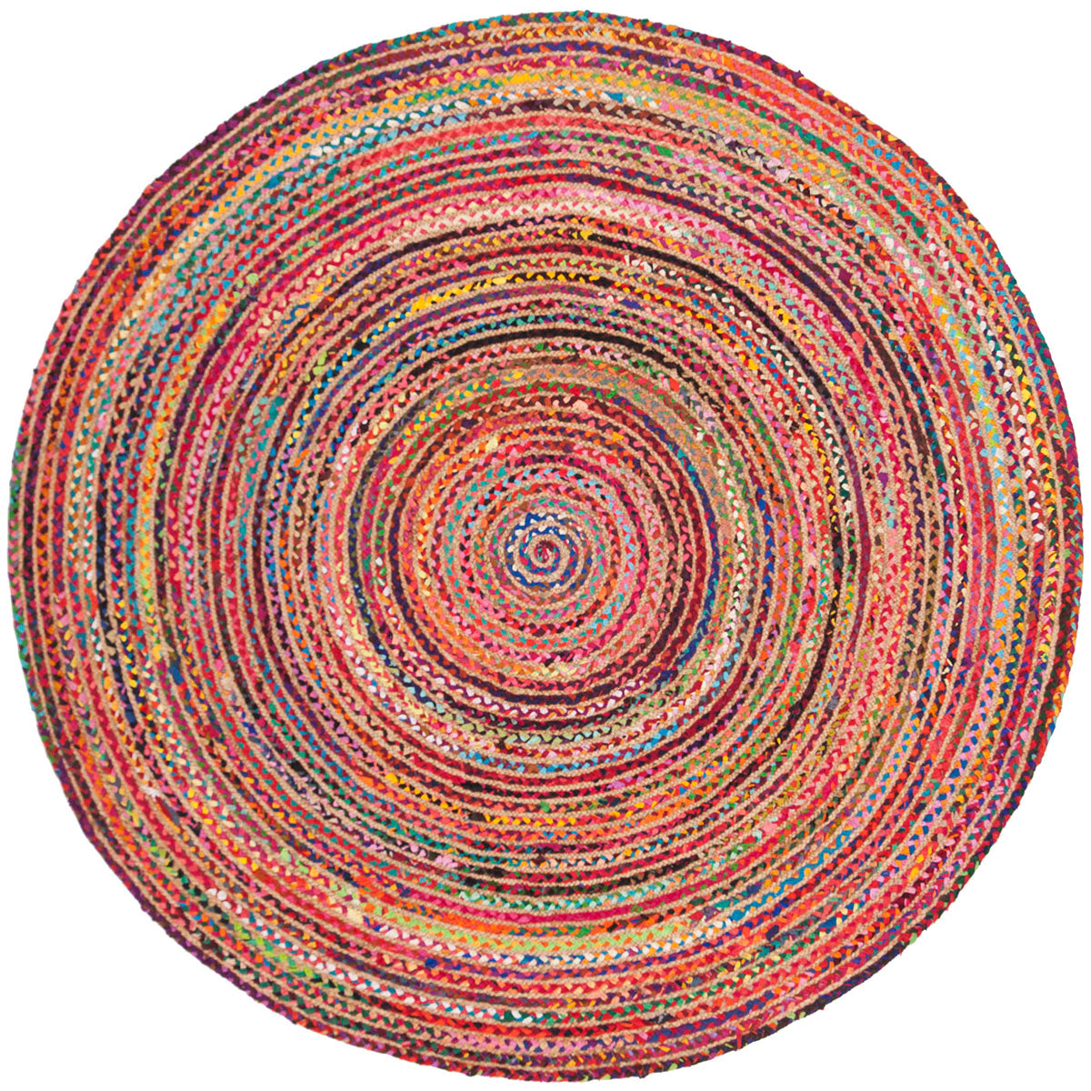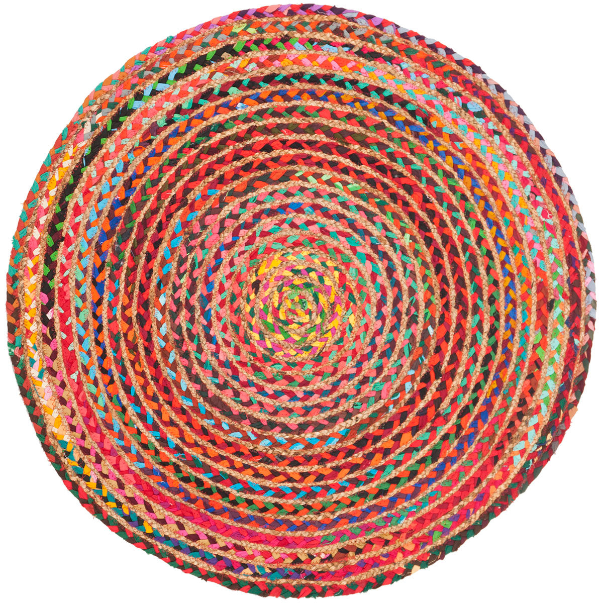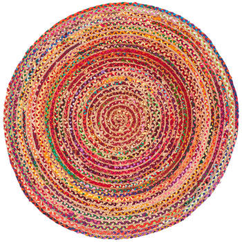Elevate your living space with our captivating 4' x 4' round area rug, a harmonious blend of tradition and vibrancy. This exquisite piece boasts a rich tapestry of red and multi-colored hues, carefully hand-woven using time-honored techniques. Each rug is expertly crafted in India from a superior blend of 70% cotton and 30% jute, ensuring both softness and durability.