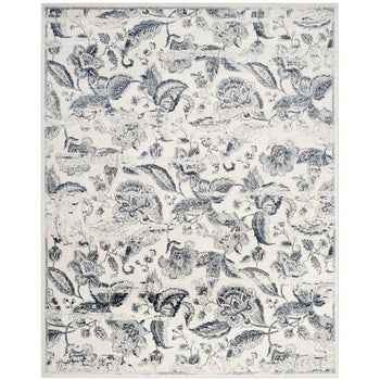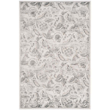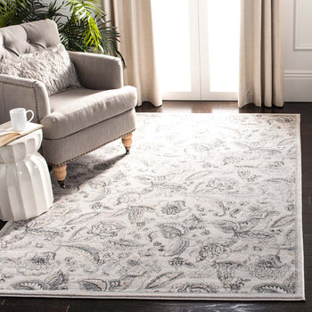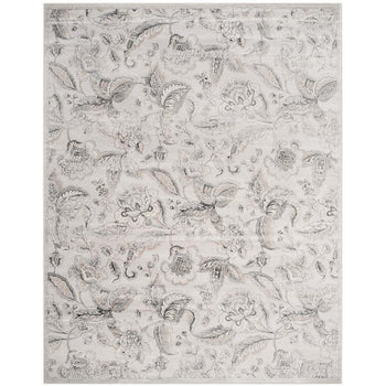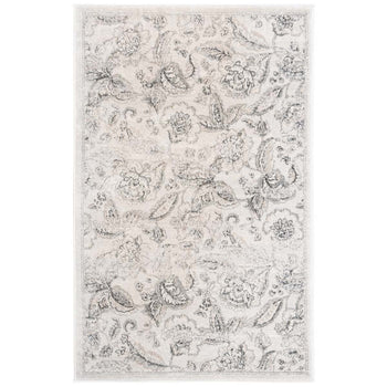 With a plush 3/4" pile height that caresses your feet, this sumptuous rug features a refined cream and light grey palette that effortlessly harmonizes with any interior design. The intricate rug pattern depicted in the image showcases a sophisticated array of classic florals and scrollwork, making it a striking centerpiece that commands attention while still maintaining a serene and welcoming atmosphere.