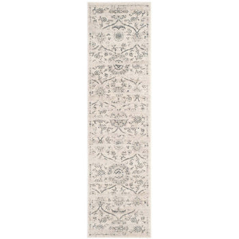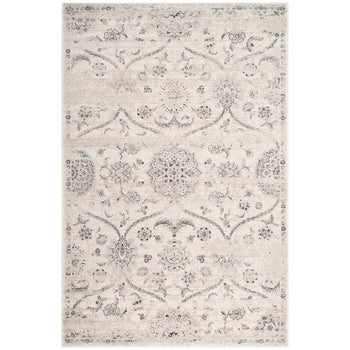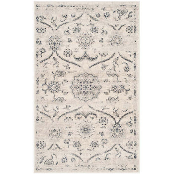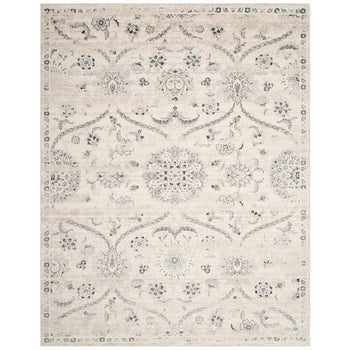 The design of this rug draws inspiration from classic motifs, as seen in the image, displaying intricate patterns that evoke a sense of heritage and sophistication. The serene cream and light grey color palette perfectly complements a wide range of decors, infusing your home with a serene and inviting atmosphere.