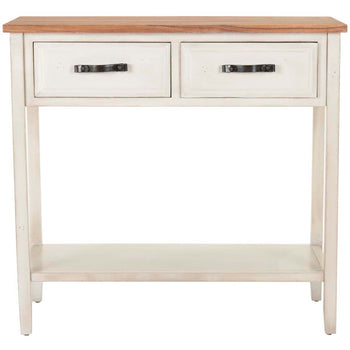 The Carol Console, composed of elm and poplar wood, speaks a country casual language perfect for welcoming spaces. A natural wood top perched on white birch finished drawers and frame is ideal in kitchens, foyers, or living rooms.