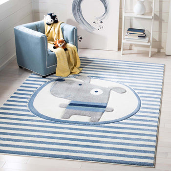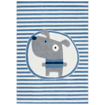 Brighten up your child's play area with this charming and playful Ivory/Blue Runner Area Rug. Designed to inspire and bring a touch of whimsy to any room, this 2' x 8' runner rug features a delightful pattern with friendly cartoon style dogs in circular frames, interspersed with classic horizontal stripes that add a sense of order and calm to the playful motif.