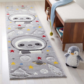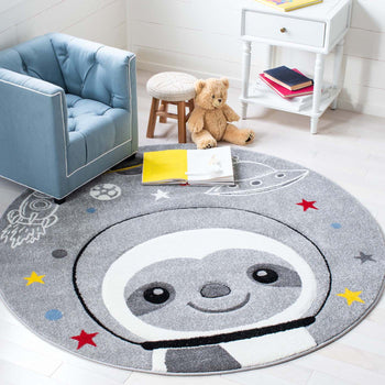 Our square rug brings a universe of adventure with a playful astronaut inspired design that is sure to ignite storytelling and joy. Adorned with images of smiling astronauts, rockets, planets, and stars against a soothing grey and ivory backdrop, this piece offers a blend of imagination and subtle color that will complement your child's space.