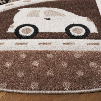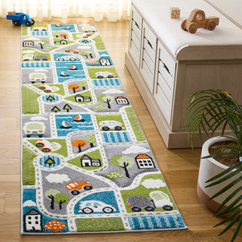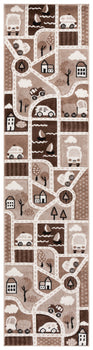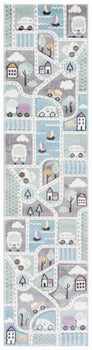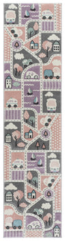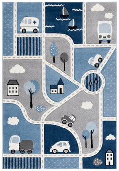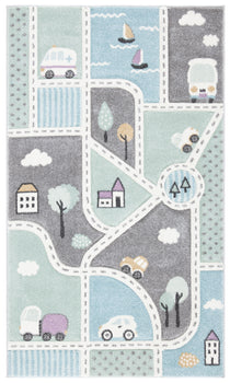 The rug's enchanting design features a playful cityscape with meandering roads flanked by cute houses, trees, and vehicles in a harmonious palette of colors. The shape and comfortable 5/8" pile height provide a generous and cushioned play surface that will stimulate your child's imagination and add a pop of color and fun to their room.