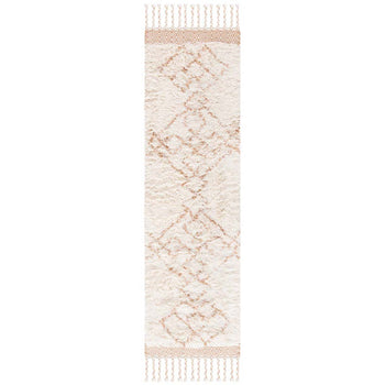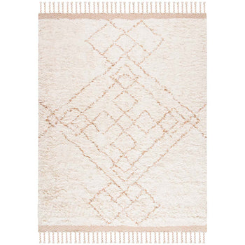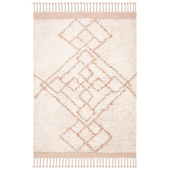 The rug features a distinctive pattern, showcased in the image provided, that speaks to the bohemian spirit?geometric shapes and symbols woven in a beautiful Rust hue against an Ivory background. This pattern is visually compelling and adds a touch of intrigue to any room. The fringe detailing along the edges further accentuates its boho aesthetic and handmade appeal.