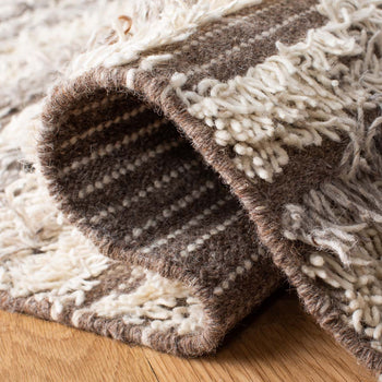 This piece boasts a unique texture, reminiscent of gentle waves with alternating ribbons of natural and ivory, adding depth and interest to your space. The hand-woven technique ensures that each rug is truly one-of-a-kind, while the wool composition guarantees warmth, durability, and a soft feel.
