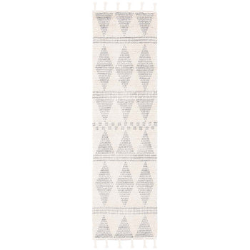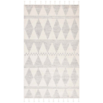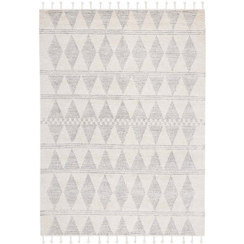 Featuring an intricate pattern that combines geometric shapes with subtle tribal motifs, the ivory and grey color palette provides a neutral yet eye-catching complement to any decor scheme. The pattern, visibly shown in the image despite the size difference, captures attention with its symmetrical diamond design, punctuated by delicate detail work, imparting a sense of balance and sophistication.
