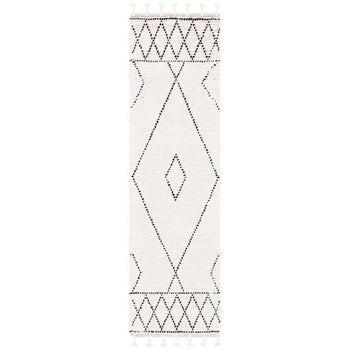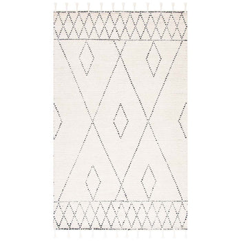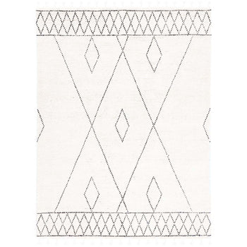 Inspired by bohemian style, the rug features a bold and graphic pattern that exudes a sense of free-spirited artistry. The ivory background is adorned with striking black geometrical motifs that provide a visual interest and an air of timeless grace. This charming contrast creates a versatile piece that complements a variety of decors, from minimalist to eclectic.