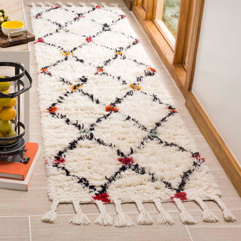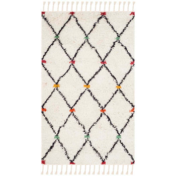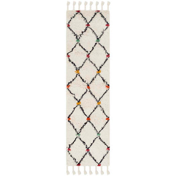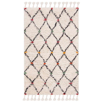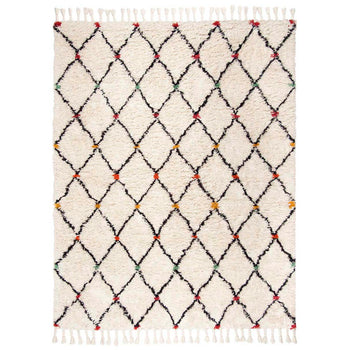 Drawing inspiration from the image provided, the rug pattern features a diamond lattice design, each intersection highlighted by a pop of color, imbuing the space with just the right amount of visual interest without overwhelming the decor. The playful tassel fringe at the edges adds a bohemian flair and a touch of whimsy to the overall design.