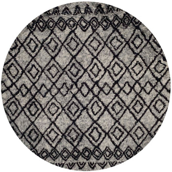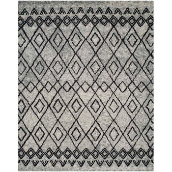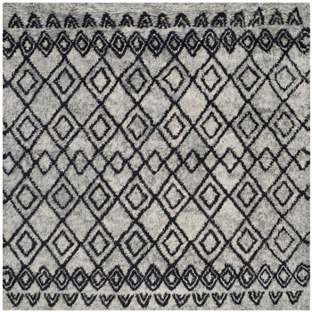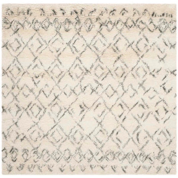 The rug's design is a harmonious marriage of ivory and grey tones, presenting a pattern that is both timeless and expressive. The ivory background exudes a serene and calming ambiance, while the grey accents form a tribal-inspired diamond pattern that graces the surface with a whisper of sophistication and an organic, handcrafted charm.