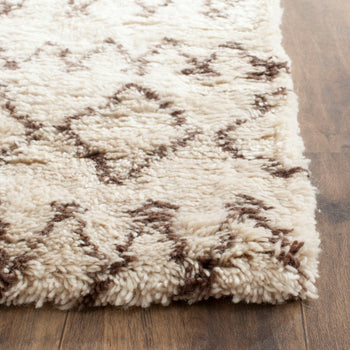 Featuring an alluring ivory and dark brown color palette, this rug showcases a distinct pattern that exudes a sense of luxury and comfort. The intricate motifs present a classic diamond design that is both understated and captivating.