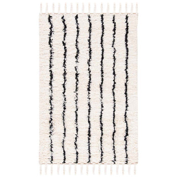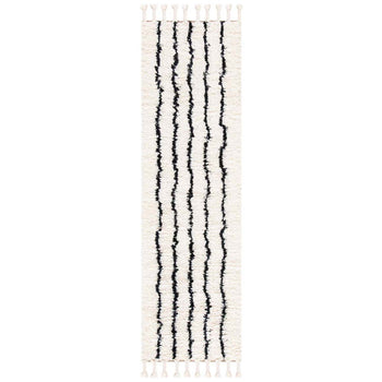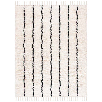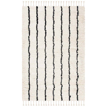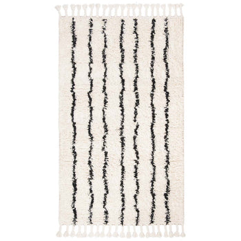 Our bohemian-style rug features a striking pattern, as displayed in the image, characterized by bold black linear accents set against a creamy ivory background. This contrast creates a dynamic visual effect that will bring life to your interiors, making it a focal point in any room. The rug's crisp lines and eye-catching design reflect an eclectic mix that is both modern and timeless.