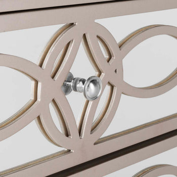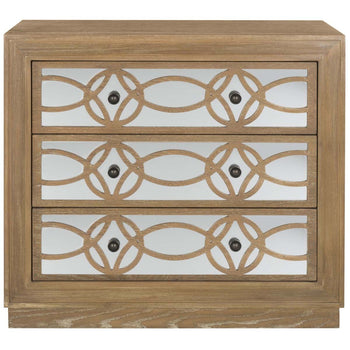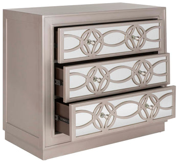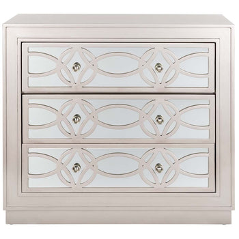 A contemporary iteration of Deco decadence, this deluxe Catalina Chest emanates lavish glamour in any interior. Designed with an extravagant mirror background, Catalina's sophisticated guilloche pattern shines fabulously against the champagne finish on its three spacious drawers and frame.