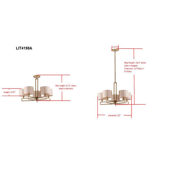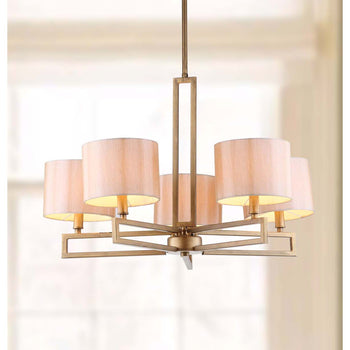 Contemporary meets Arts & Crafts style in the clean lines of the Catena Chandelier. This handsome five armed design is crafted of steel with an antique gold finish, paired with cream fabric shades for a room flattering glow.