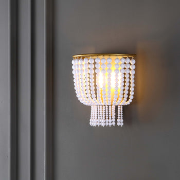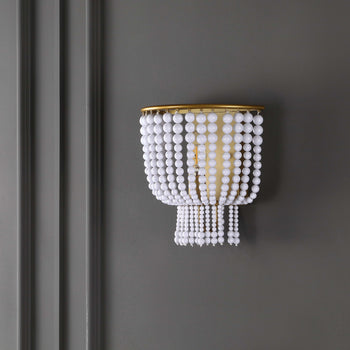 Boho goes glam in this captivating Celyn Wall Sconce. Celyn's cascading white acrylic beads emanate a rich sense of depth and motion, while its gold frame and candle-style bulb lend a touch of classic elegance.