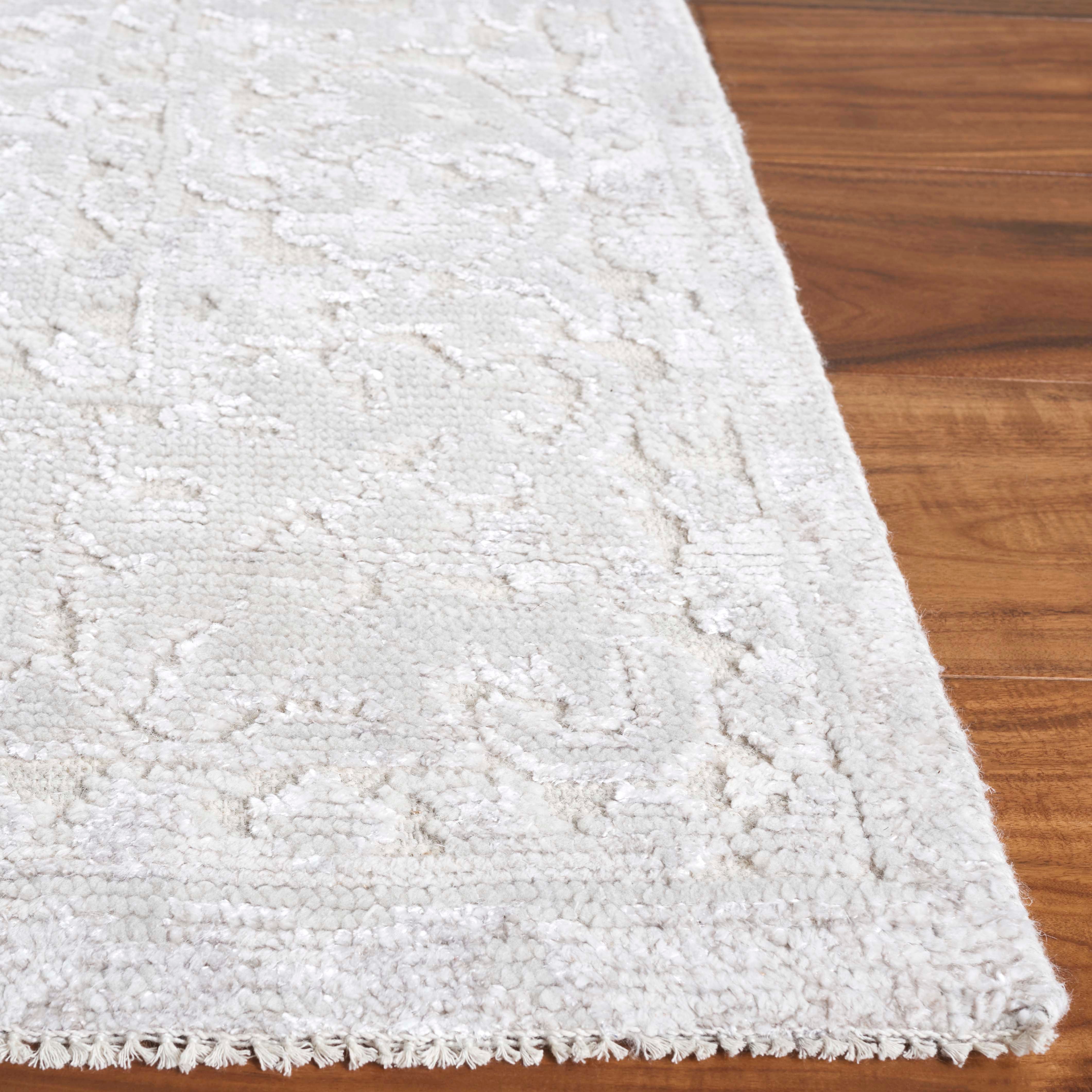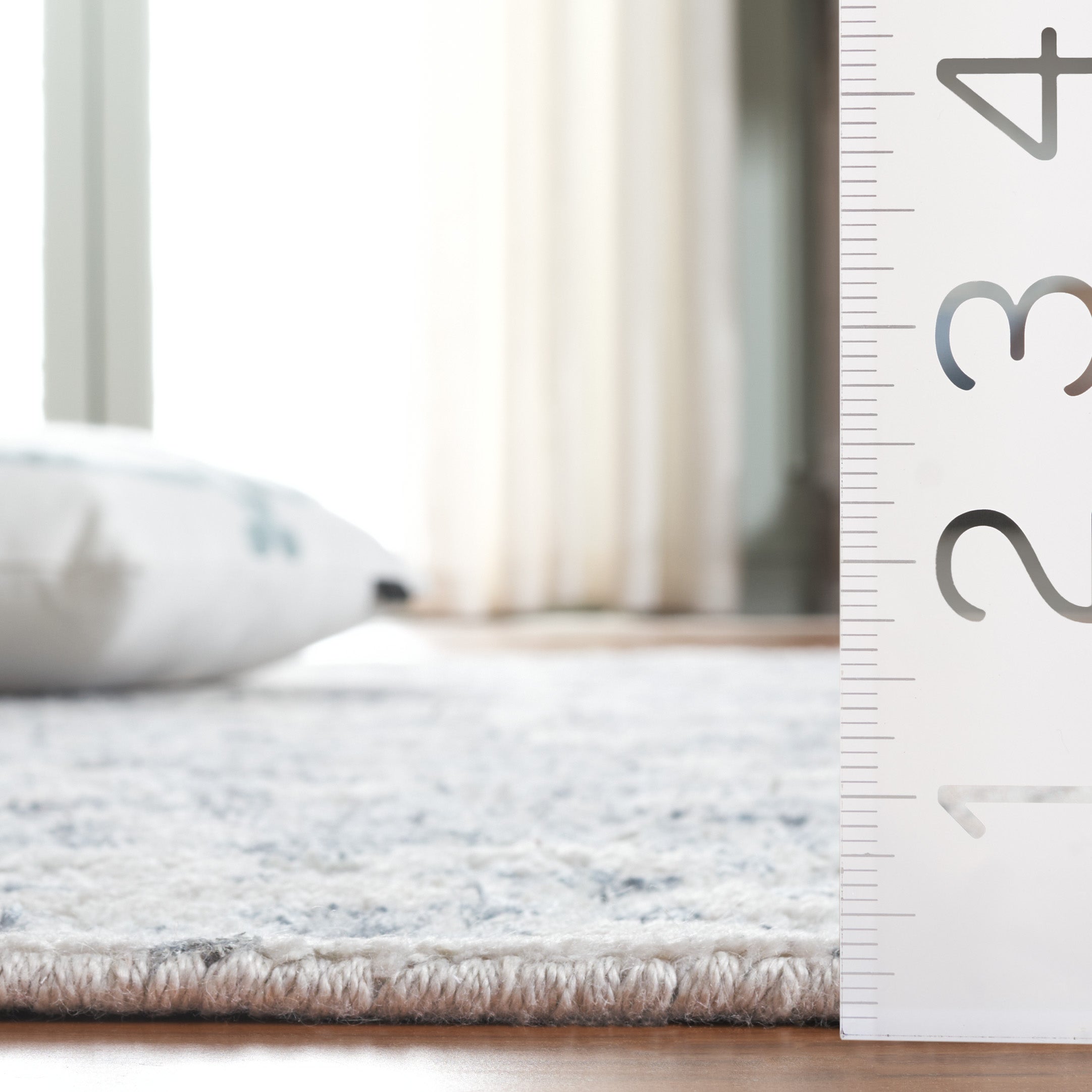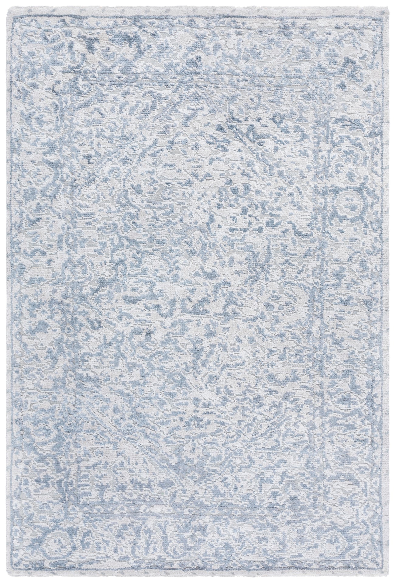 Elevate your living space with the exquisite craftsmanship and elegant design of our 6' x 9' hand-knotted area rug. This medium rectangle rug, expertly woven in India, is a masterpiece of contemporary style, bearing a sophisticated navy and grey color palette.