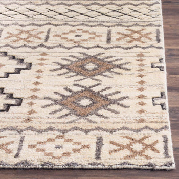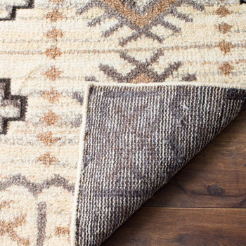 The rug features a captivating pattern that pays homage to its cultural roots, displaying symmetrical designs and tribal motifs in a tasteful camel color palette. The neutral tones are versatile, ensuring this piece can integrate seamlessly into various interior design themes, from contemporary to traditional.