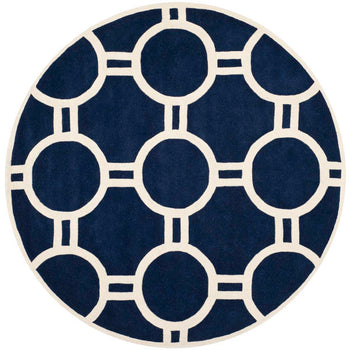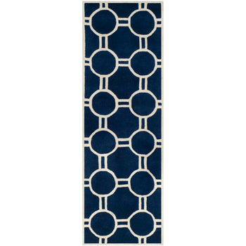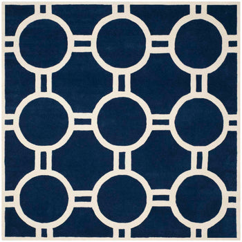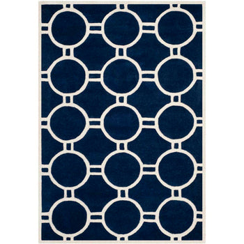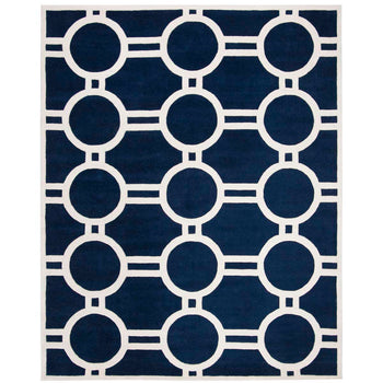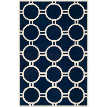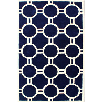 Drawing inspiration from a rich cultural tapestry, the rug presents a bold geometric pattern that seamlessly blends contemporary design with classic style. Its deep navy hue, vividly contrasted by luxurious ivory accents, makes a powerful statement and adds depth to any room.