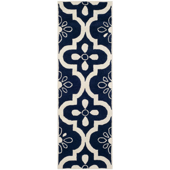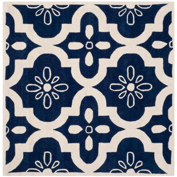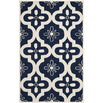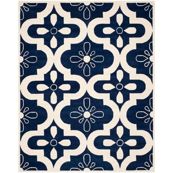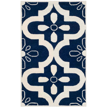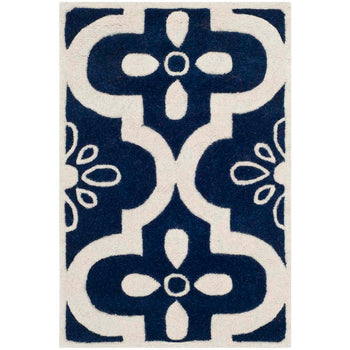 Drenched in a sophisticated palette of dark blue and ivory, this rug features a striking pattern that draws inspiration from age-old motifs. The bold, symmetrical design is an homage to classic aesthetics while offering a fresh, contemporary look, making it a versatile choice for your home decor. The contrast of the dark blue against the creamy ivory exudes a sense of depth and luxury.
