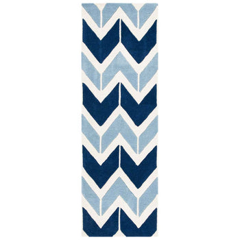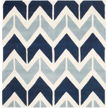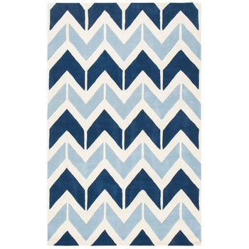 Elevate your living space with the luxurious handcrafted charm of our Woolen Chevron Area Rug, a captivating piece that marries artisan craftsmanship with the timeless elegance of Indian rug-making traditions. This 3' x 5' small rectangle rug is a stunning addition to any room, featuring a bold chevron pattern that beautifully juxtaposes dark and light blue hues, creating a dynamic visual impact.
