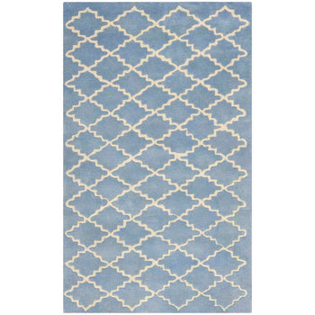 At the heart of its charm is the rug's captivating pattern, featuring intricately interlocking trellis motifs that are both bold and graceful. The cream accents outlining each geometric shape add a subtle yet striking contrast, enhancing the visual appeal and making it a versatile choice for various interior d?cors.
