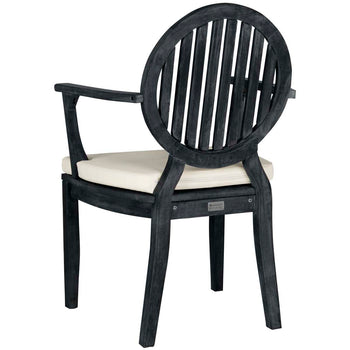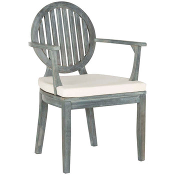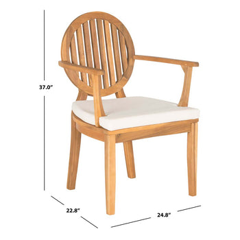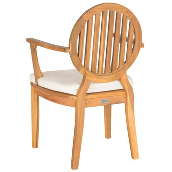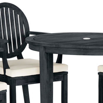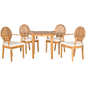 The ultimate expression of contemporary style, the Chino 5 piece dining set features acacia wood frames in natural and seat cushions covered in beige all weather Textilene fabric. Round back slatted chairs echo the coordinating table design.