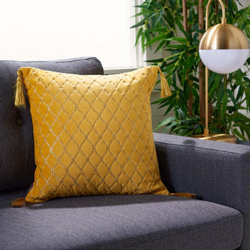 Bring a touch of bohemian beauty to your Decor with this eye catching Cilan Pillow. Flaunting a textured Moroccan lattice over its luxuriously soft cotton velvet, Cilan brightens any space with its bold yellow hue and playful tassel details.