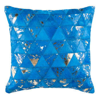 Steeped in high fashion and elegant design, the Clairton Metallic Cowhide Pillow lends artistic glamour to home decor. Splashes of metallic gold add a dimension rich finish to the vibrant blue cowhide cover with a convenient hidden zipper providing easy care access. Clairton is a sublime choice for the Hollywood inspired living room, family room or master suite.