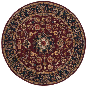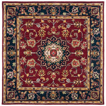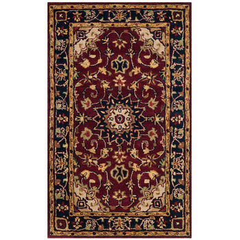 The design of this rug is a harmonious blend of classic patterns with intricate floral and geometric motifs that draw the eye and create a focal point in your space. The deep, rich burgundy provides a warm, inviting base, perfectly complemented by the contrasting navy detailing which adds depth and an air of nobility to the overall aesthetic.