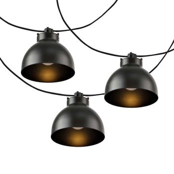 Dramatic and industrial, these captivating Claudie LED Outdoor String Lights were designed to bring the vibe of a downtown rooftop soiree to your outdoor living space. Designers love its ten black cloche shades that give a theatric glow when lit.