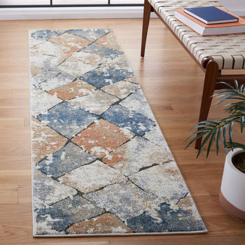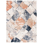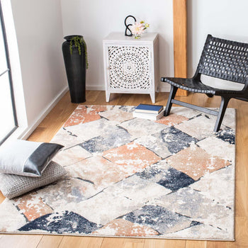 The rug features an inviting palette of ivory and navy, complemented by hints of other colors that add depth and dimension to the geometric pattern adorning its surface. The timeless style is matched by the durability of the construction, as the rug is power-loomed using a blend of 95% Polypropylene and 5% Polyester, ensuring long-lasting performance and easy maintenance.
