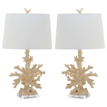 Brimming with chic coastal style, the Coral Branch table lamp perfectly replicates ocean reef coral in creamy white, with a whimsical coral finial. This adorable set of two lamps features a contemporary bell shaped, white cotton shade and acrylic base.