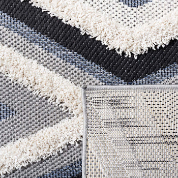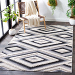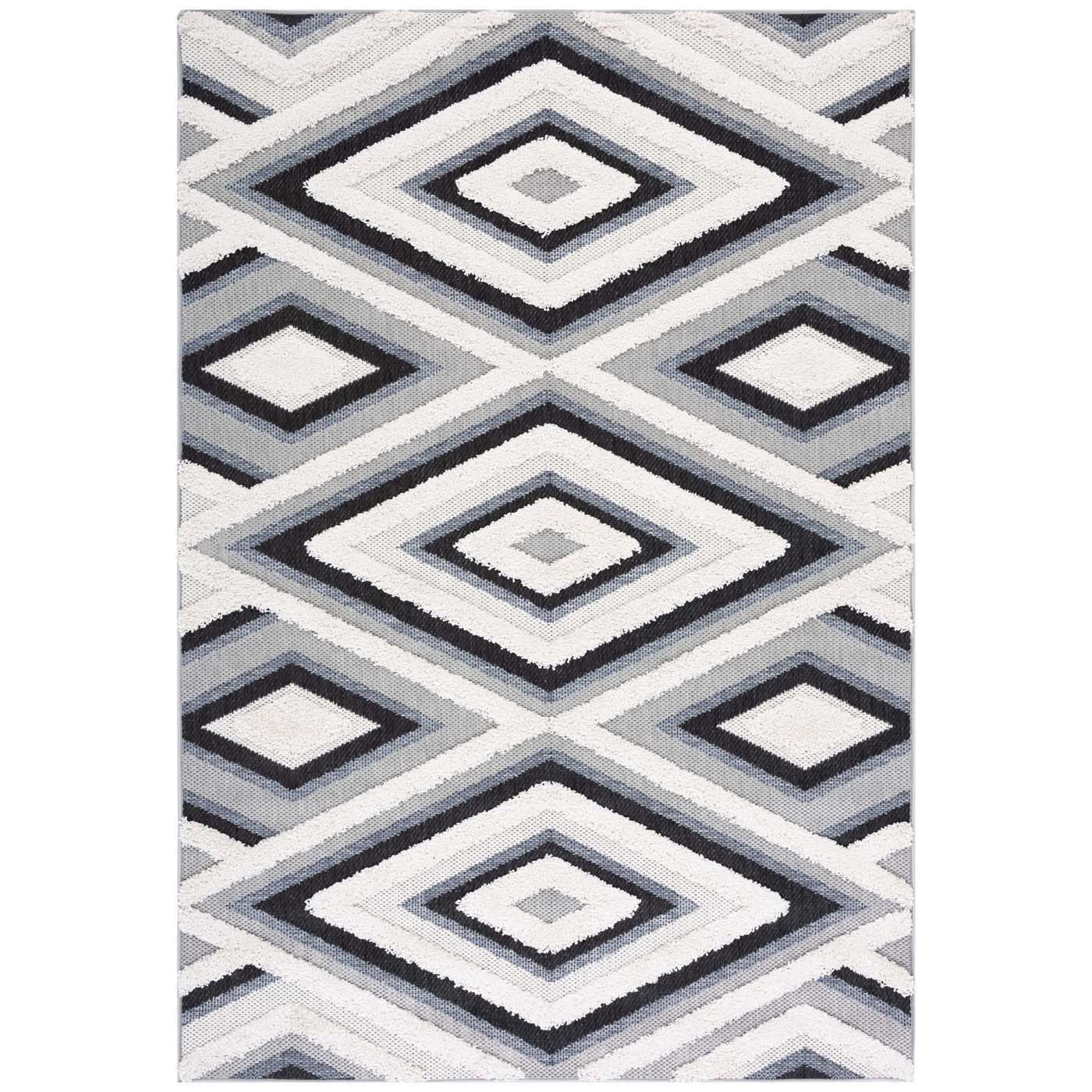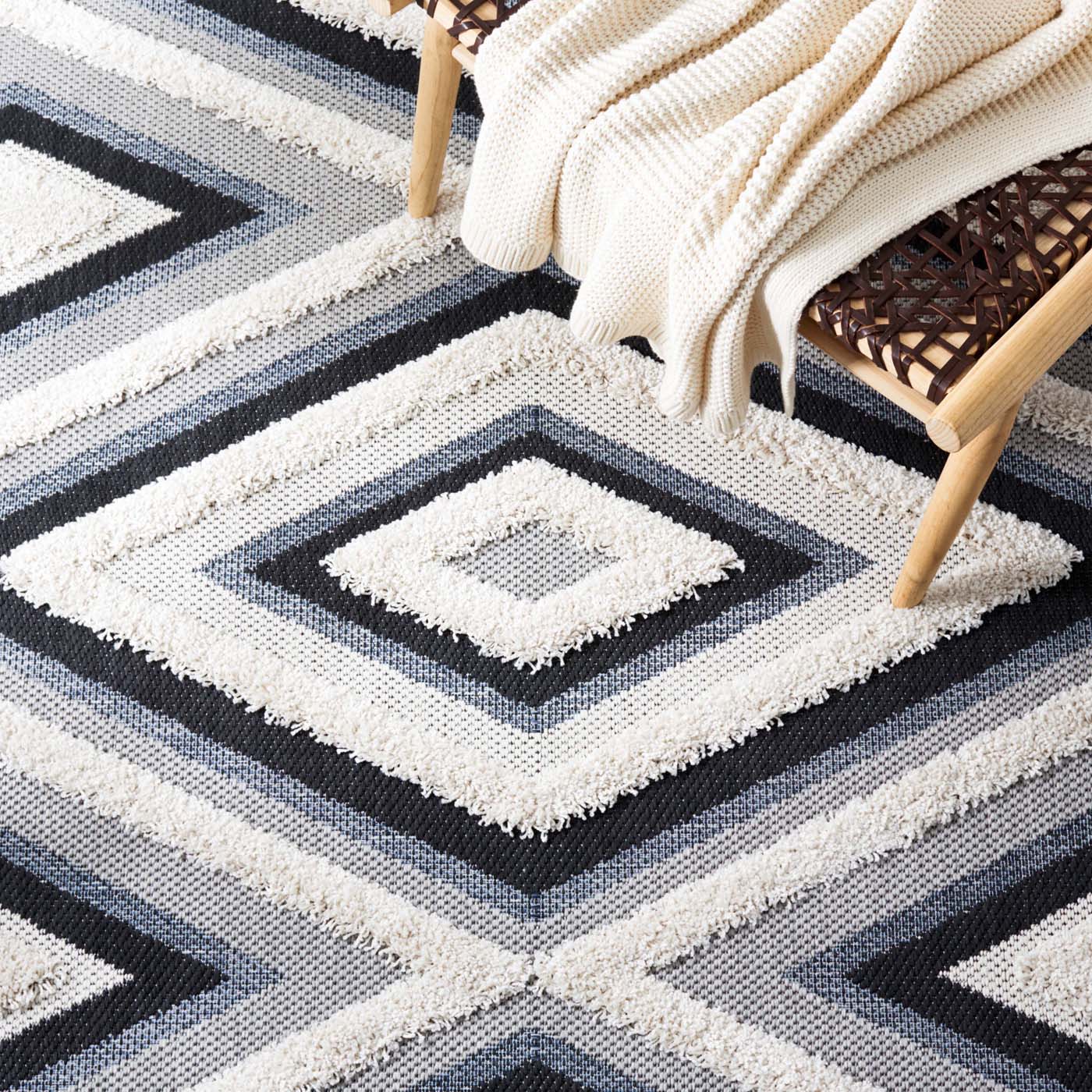 Crafted using a high-tech Power Loomed technique, this rug ensures both durability and fine detail, with a construction of 100% POLYPROPYLENE that stands up to traffic and weather while being easy to clean. The dynamic geometric pattern captured in the image showcases a series of concentric diamonds and angular lines that create a sense of depth and sophistication, sure to complement a variety of decor styles.