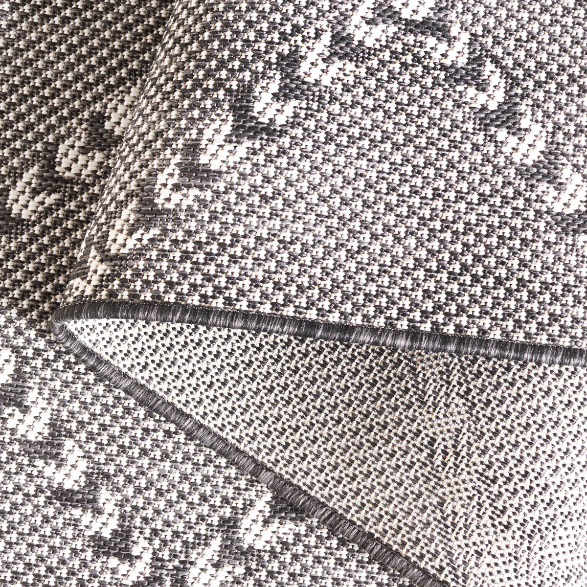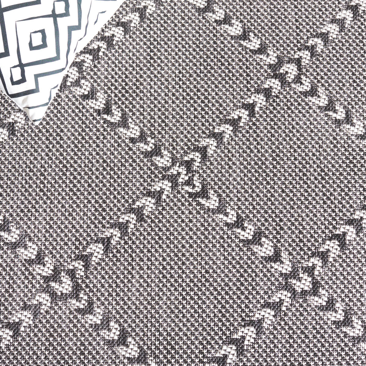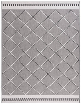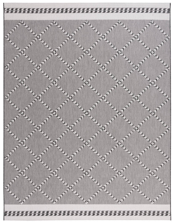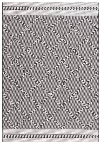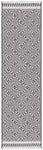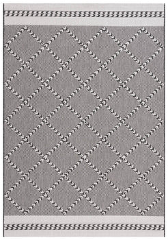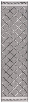 Available in a versatile 2' 3" X 8' runner shape, it is designed to enhance hallways, kitchens, or any long and narrow space both indoors and out, thanks to its Indoor / Outdoor style. The rug's engaging pattern, showcased in the image, features a harmonious blend of black and ivory hues arranged in a sophisticated geometric design that exudes a classic aesthetic with a modern twist.