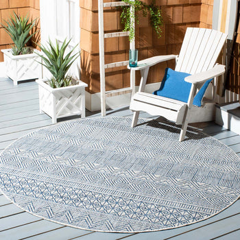 Elevate your living space with the refined elegance of our Grey/Navy Indoor/Outdoor Area Rug. Perfectly sized at 4'-5" x 6'-5", this small rectangle rug boasts a low-profile height of 1/4", making it an unobtrusive yet stylish addition to any room or outdoor area.