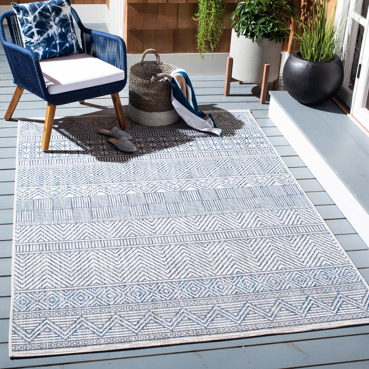 | Care Notes | Indoor-outdoor rugs are made with durable synthetic materials to help them to withstand high traffic and natural weather elements. Outdoor rugs can be cleaned with a bit more vigor, such as rinsing a rug with a garden hose to remove excessive grime. Dry indoor-outdoor rugs over a railing in the sunlight on both sides instead of placing it on a wooden deck or stone patio. |