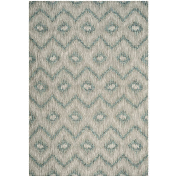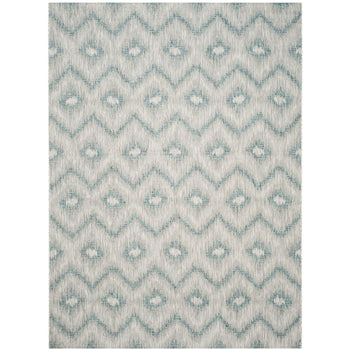 The rug showcases an intricate pattern that weaves a tapestry of harmonious symmetrical motifs across its surface, creating a visual delight in soothing hues of grey, accented with tranquil blue tones. Inspired by traditional artistry and modern living, this design seamlessly blends into any decor scheme, befitting both indoor and outdoor settings.