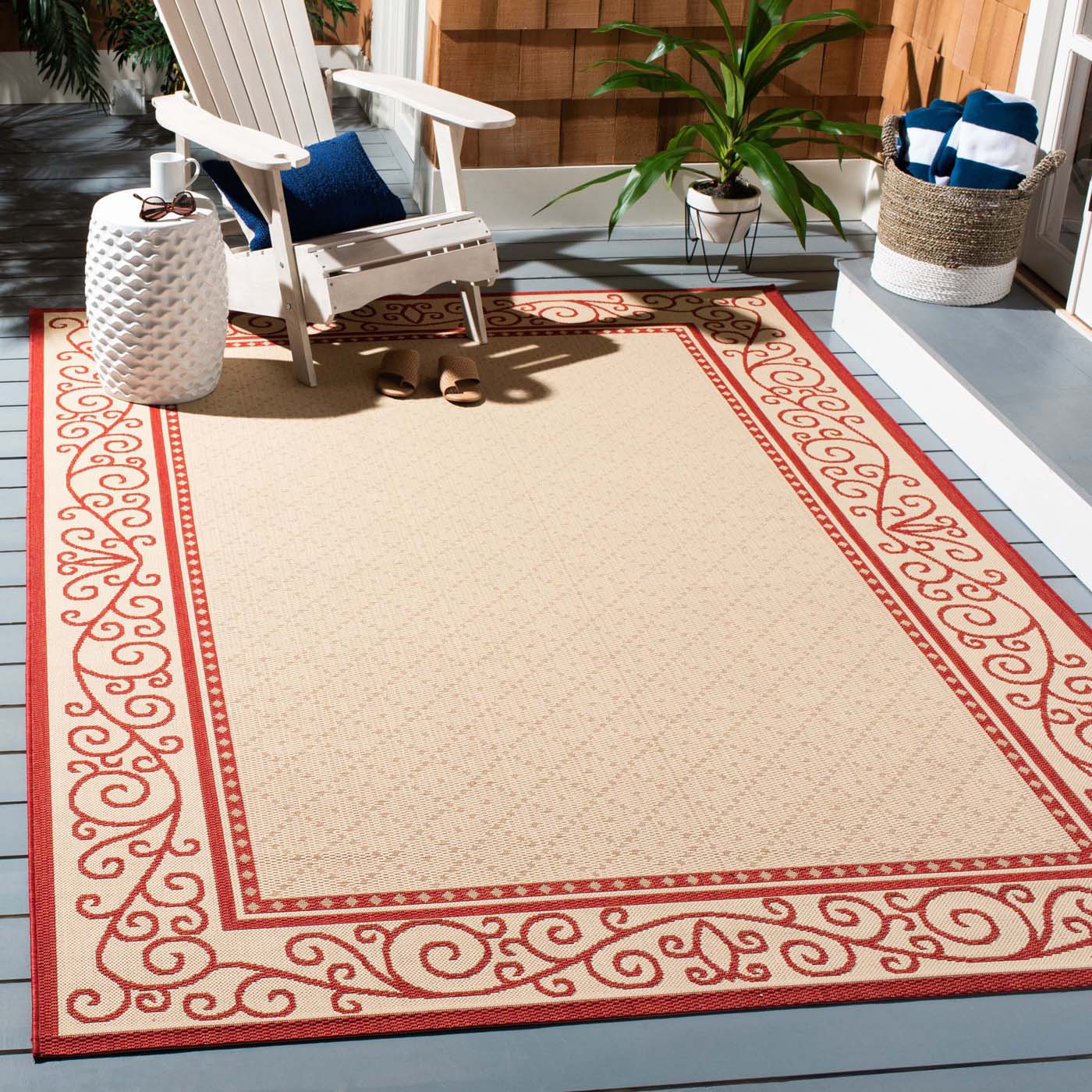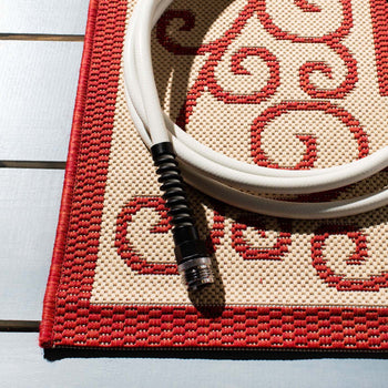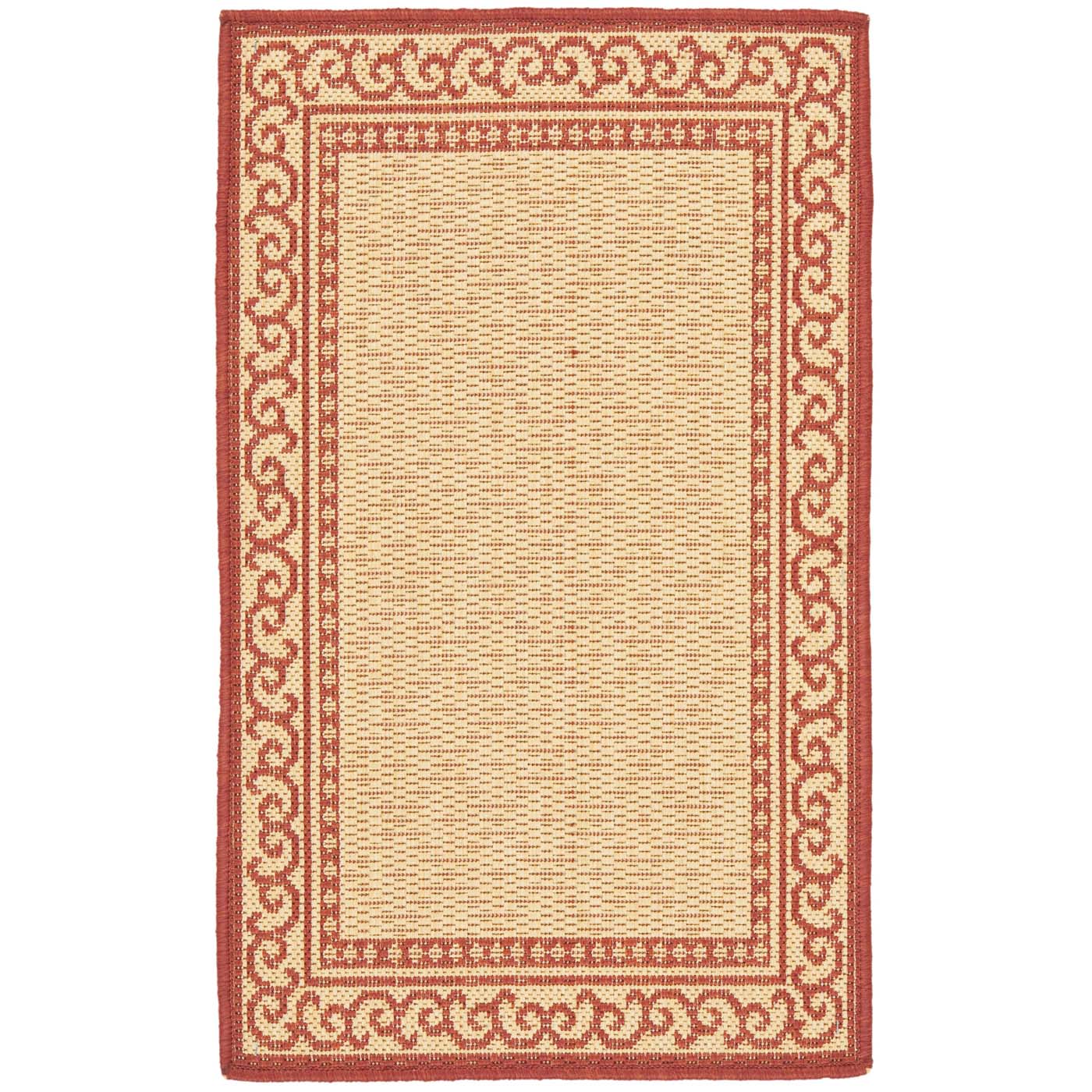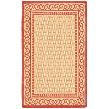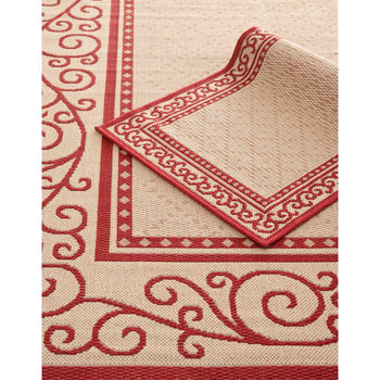 Boasting an elegant NATURAL / RED color palette, this indoor/outdoor rug is versatile enough to complement any decor scheme. The intricate border pattern imbues your floors with a timeless beauty, drawing the eye with its elaborate scrolls and delicate motifs ? a testament to the rich heritage of textile artistry.