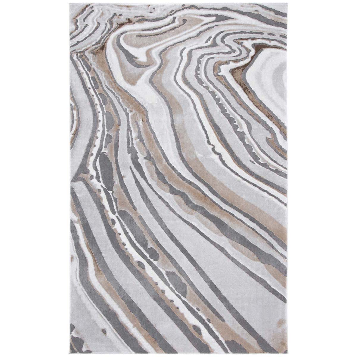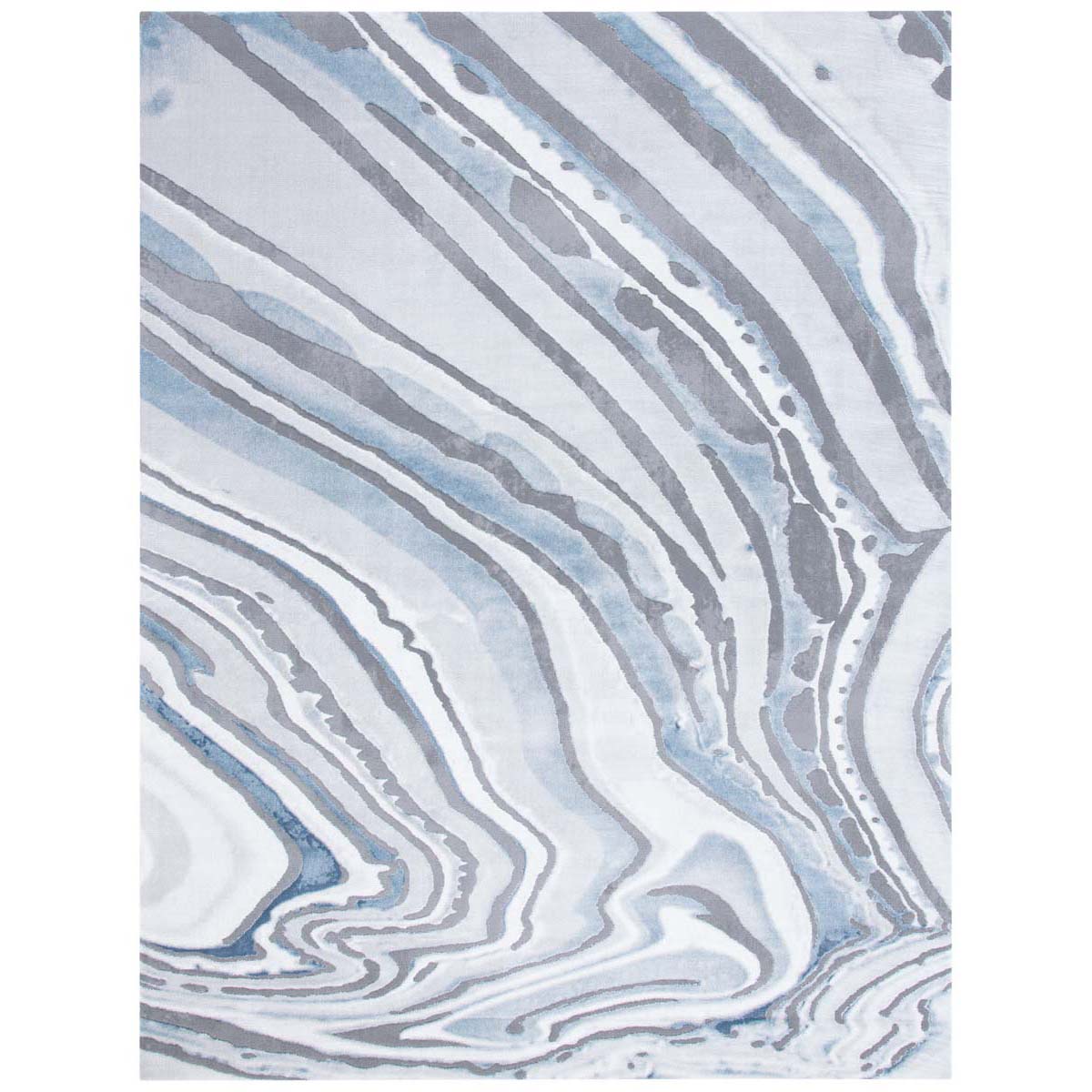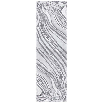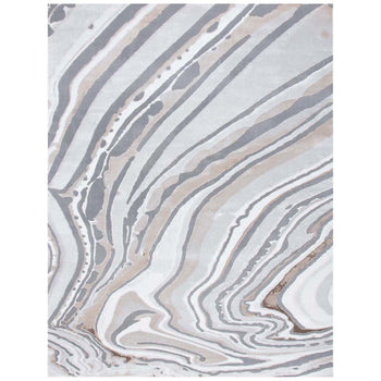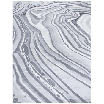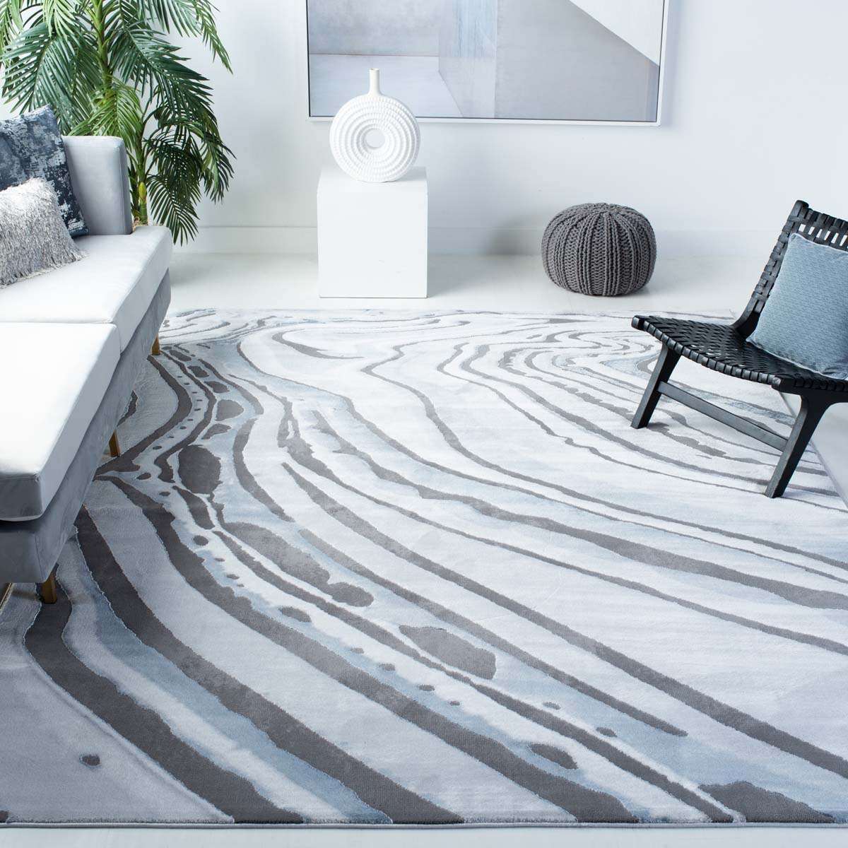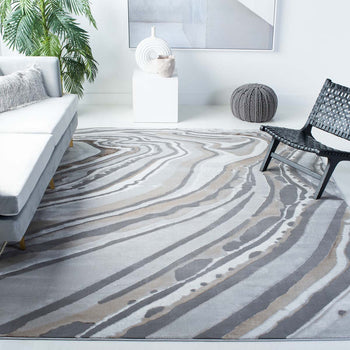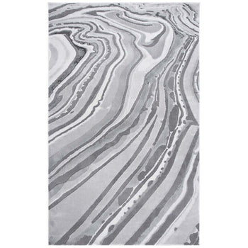 The rug exhibits a stunning light grey and grey color palette, seamlessly blending with a variety of decors while making a sophisticated statement. The captivating pattern inspired by organic lines and natural forms, visible in the image, flows across the rug, creating an illusion of movement that will bring your floors to life.