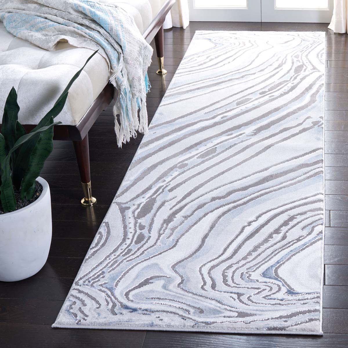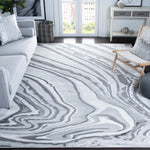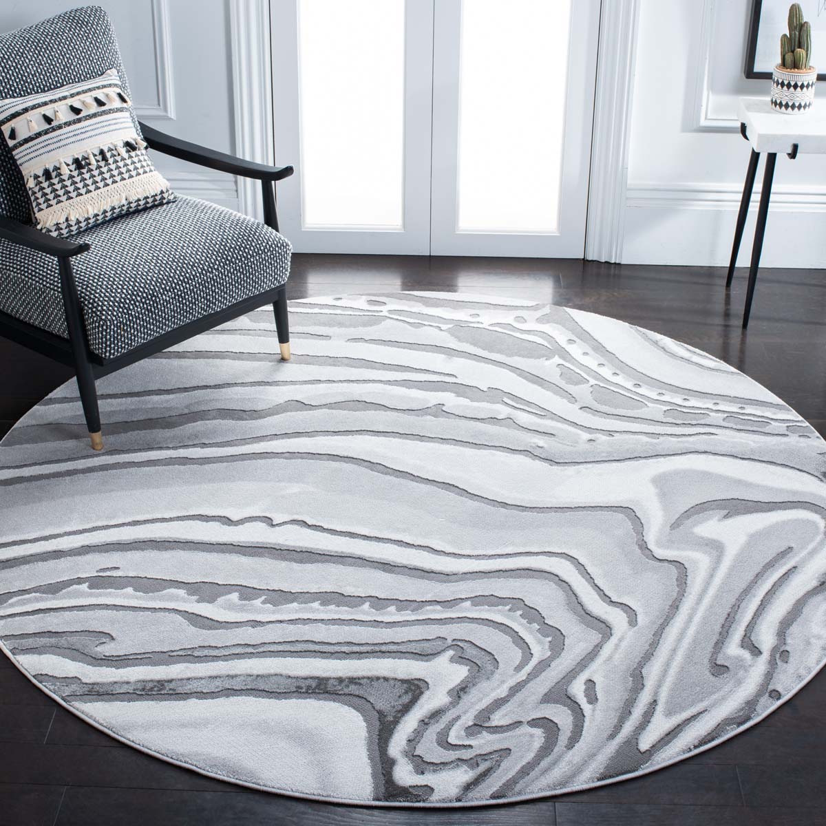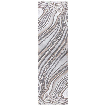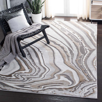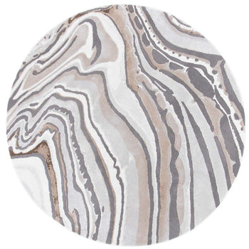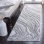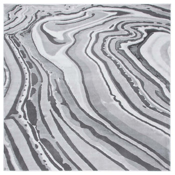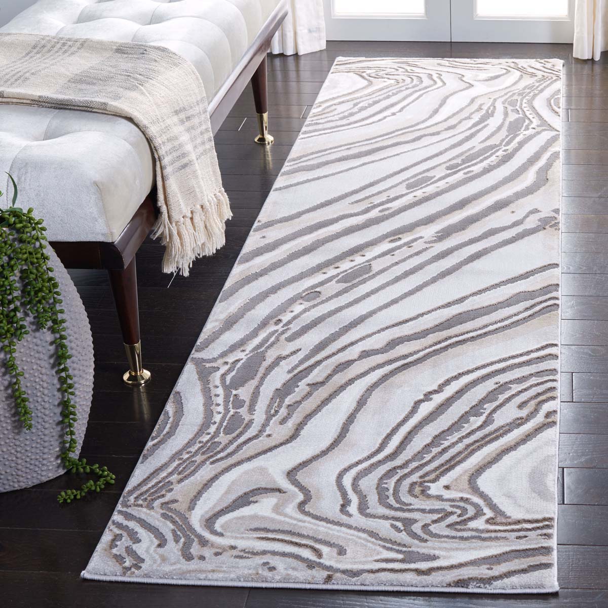 The rug exhibits a stunning light grey and grey color palette, seamlessly blending with a variety of decors while making a sophisticated statement. The captivating pattern inspired by organic lines and natural forms, visible in the image, flows across the rug, creating an illusion of movement that will bring your floors to life.