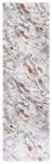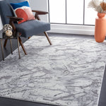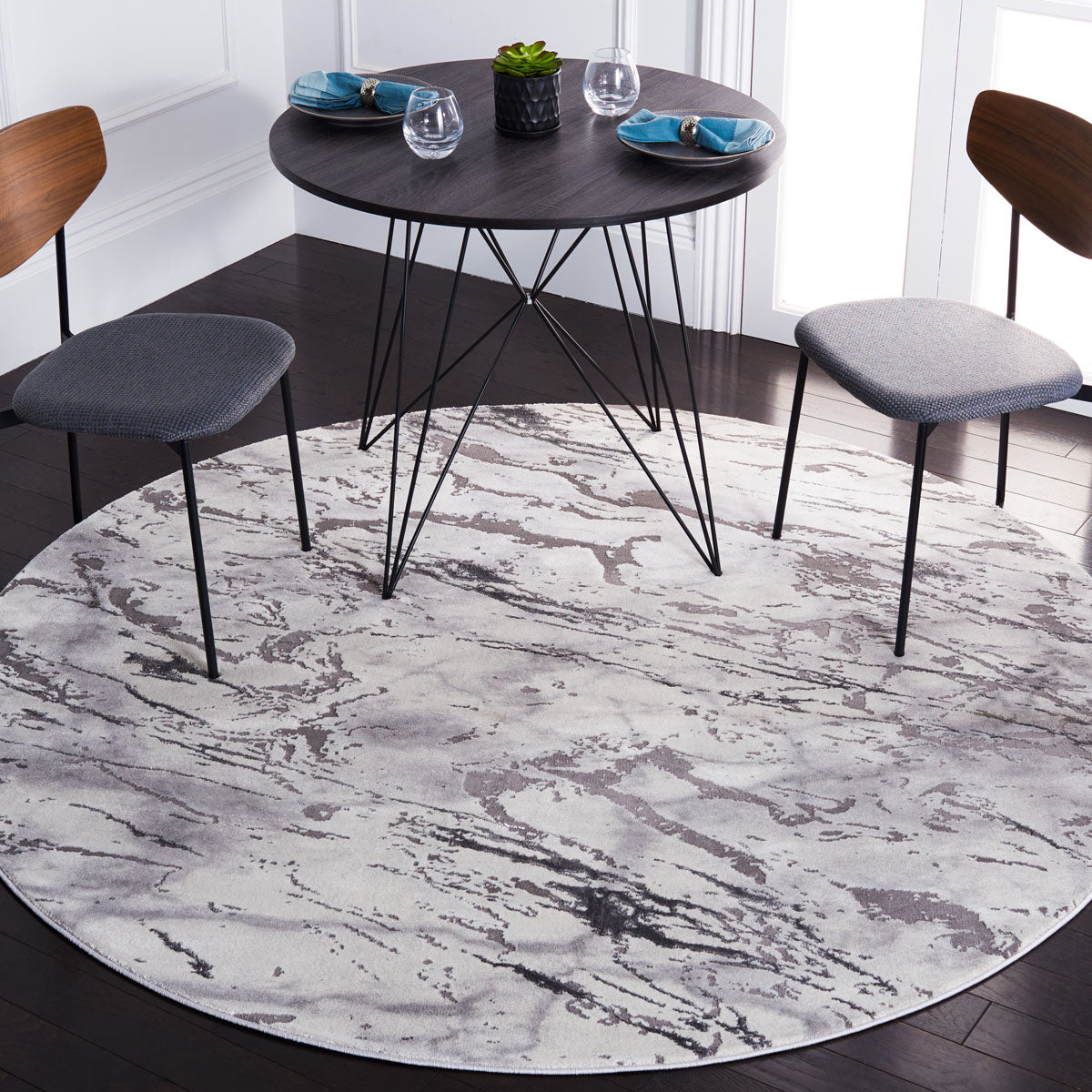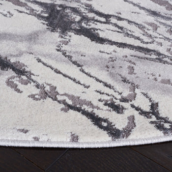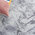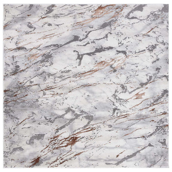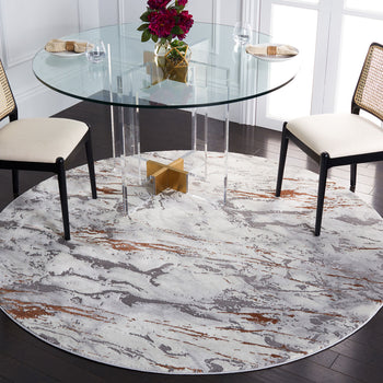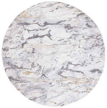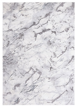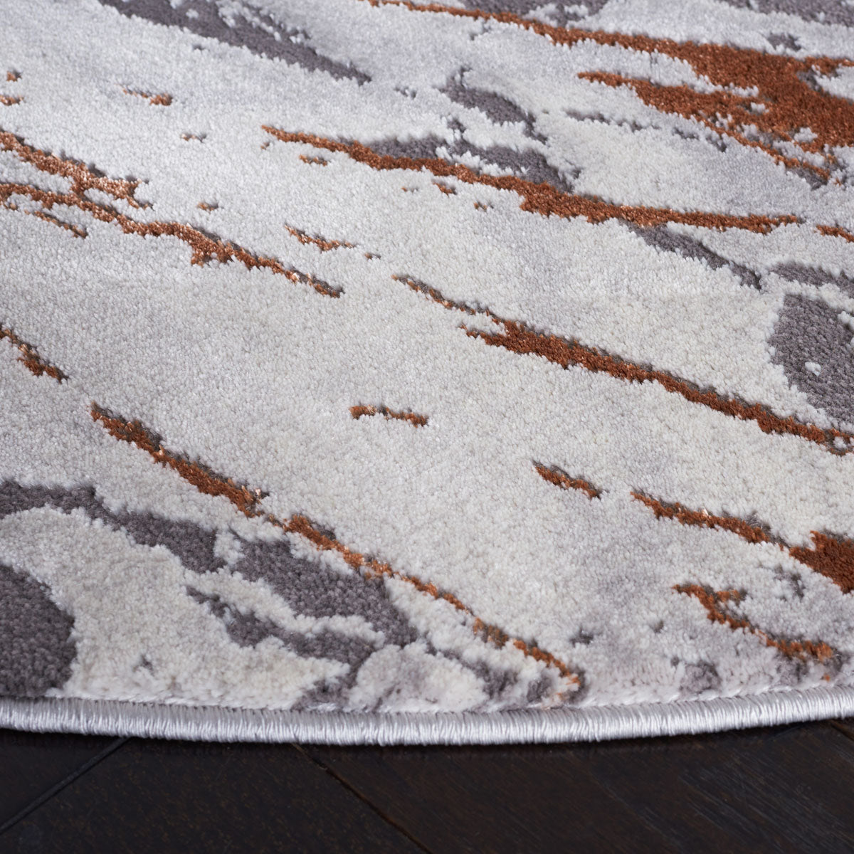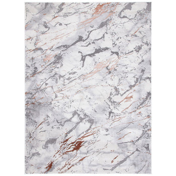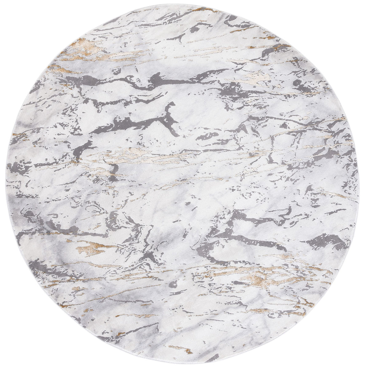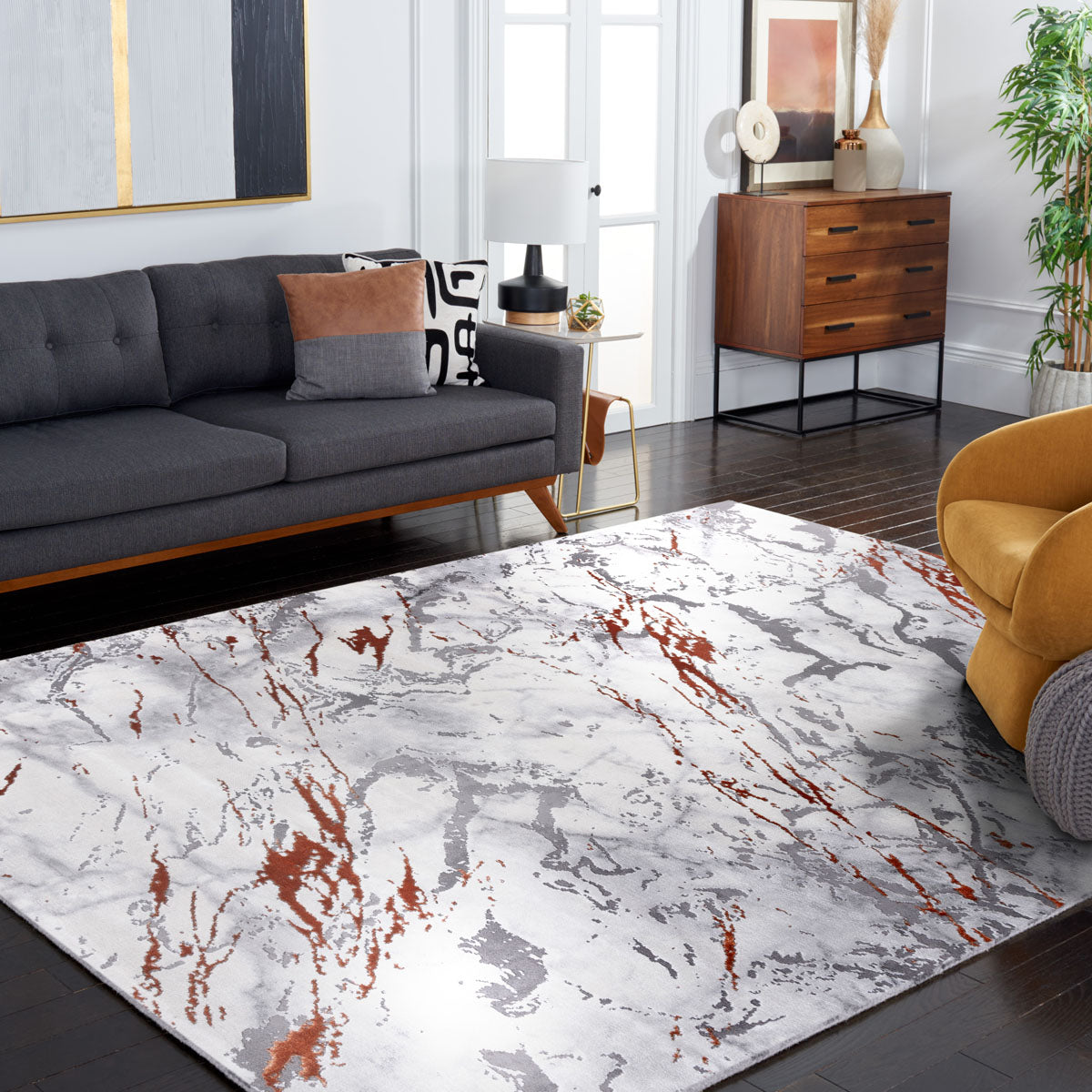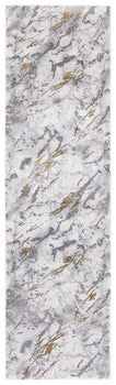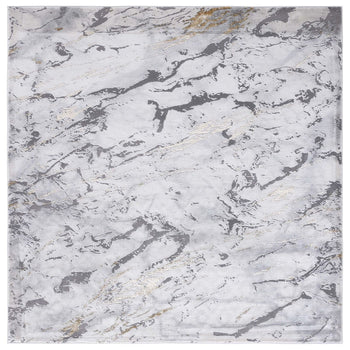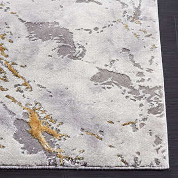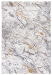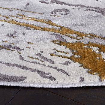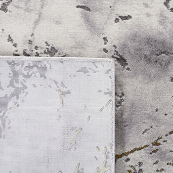 The rug's compelling design features an abstract pattern with strokes and splashes of gold over a soothing grey canvas, bringing a touch of sophistication and an artful ambiance to your decor. Its colors and patterns offer a mesmerizing aesthetic that can serve as a centerpiece or a complementary piece to your existing furnishings.